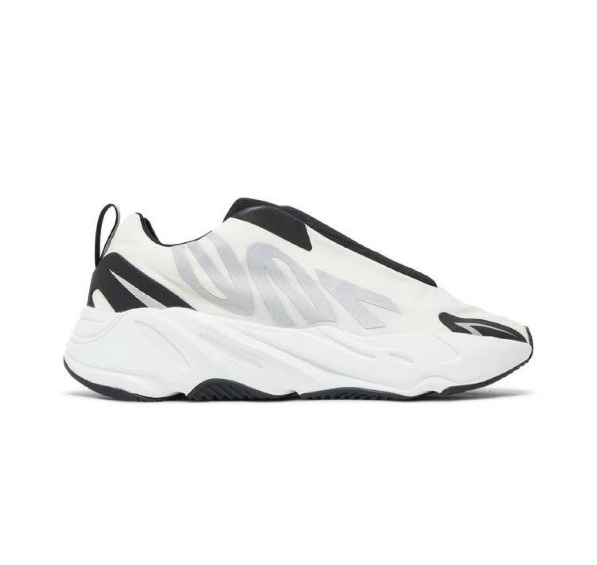 This model of the Yeezy Boost 700 MNVN comes in White with a laceless construction for simple slip-on comfort. It has a thin polyester upper that is contrasted by big Metallic Silver "700" branding and Black no-sew details. The design is completed by a Black rubber outsole sitting atop a White sculpted midsole with Boost cushioning.